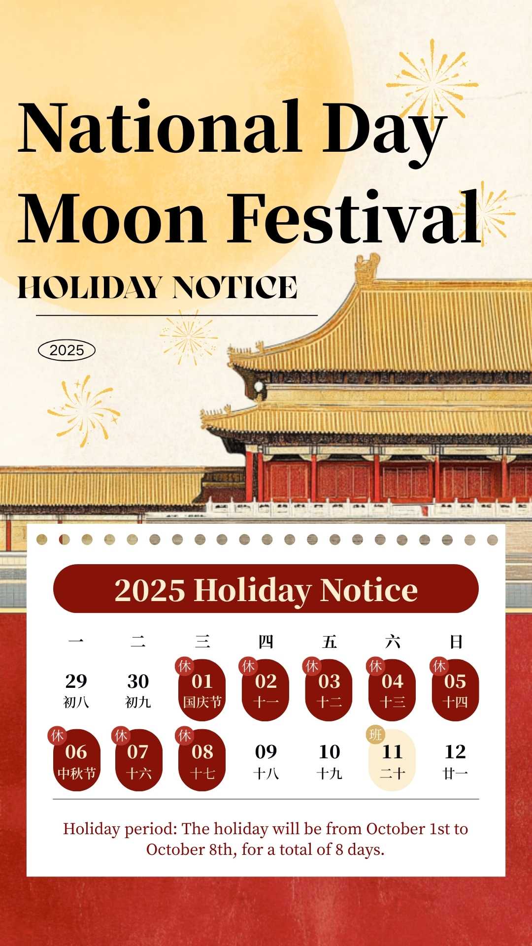Văn phòng của chúng tôi sẽ đóng cửa từ ngày 1 tháng 10 đến ngày 8 tháng 10 năm 2025 nhân dịp nghỉ lễ Quốc khánh và Tết Trung thu và sẽ hoạt động trở lại vào ngày 9 tháng 10.